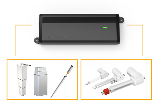 The COMPACTneo goes far beyond predefined motor setups or fixed desk concepts. With our CONFIGtool, it becomes a fully flexible DC motor control platform that adapts to virtually any motion concept. Compatible with whichever 24 V DC motor, it enables both rotary and linear applications — from TV and projection systems to sliding doors, folding furniture, office workstations, adjustable shelving, and lift mechanisms.